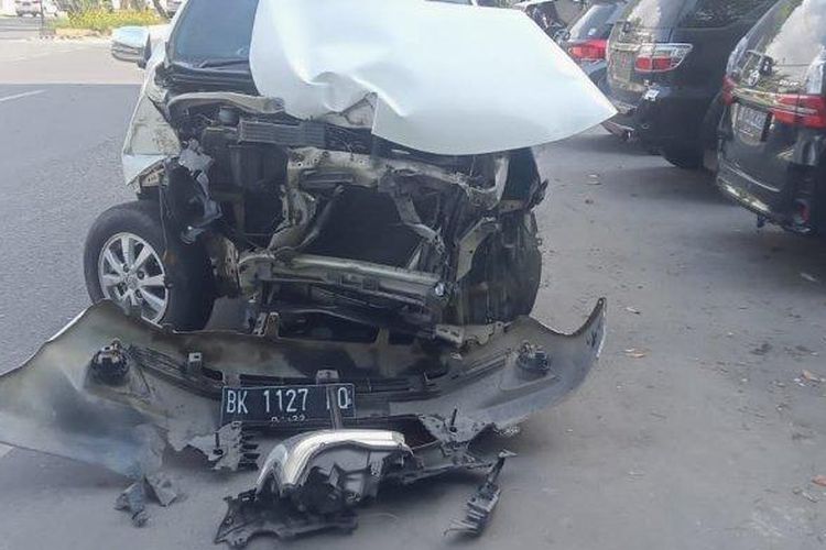 Toyota Avanza dikuliti mobil dinas Satpol PP saat hendak menyeberang jalan, bodi depan rontok parah di kota Medan