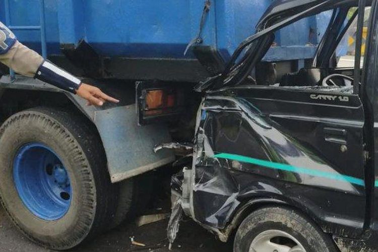 Suzuki Carry ringsek tumbuk truk dump yang oleng dikarenakan ban meletus. Kelebihan muatan jadi awal penyebabnya