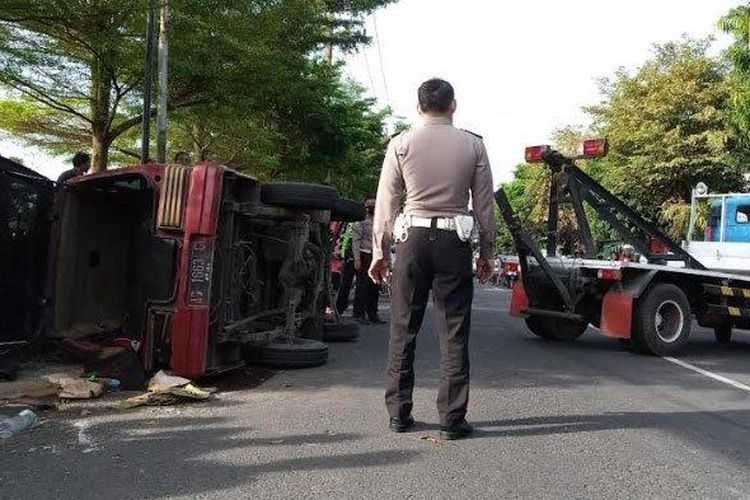 Daihatsu Hijet terguling setelah tabrak Honda PCX 160 dari arah sebaliknya karena sistem pengereman tak berfungsi di Tulungagung