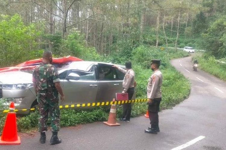 Atap Toyota Kijang Innova Reborn ambles dihujam batang pohon pinus tumbang di Karaha Bodas, Kadipaten, Tasikmalaya, pengemudi tewas mengenaskan