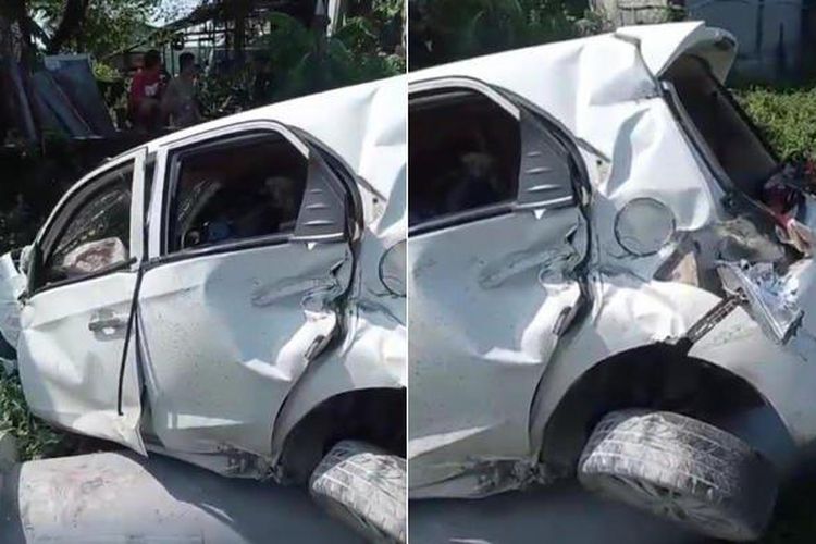 Honda Brio berisi pasangan suami istri hancur, roda belakang menjulur, bodi keriting setelah mental ditebas kereta api KA Airlangga