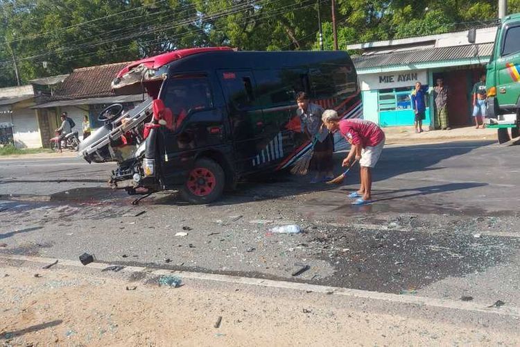 Isuzu Elf masuk jalur lawan disambut dua truk sekaligus, bodi depan dan kiri terbelah, dasbor terburai, sopir tewas mengenaskan di Bancar, Tuban