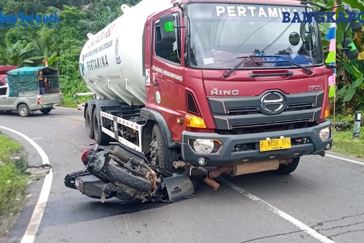 Yamaha Aerox ringsek usai digilas truk tangki LPG Pertamina di tikungan tajam. Kaki pemotor terlindas