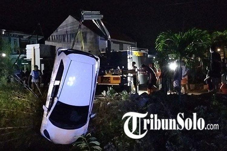 Honda Brio dikail truk transformers dengan posisi tegak lurus setelah kecemplung waduk Delingan, Karanganyar akibat pedal gas kesangkut karpet