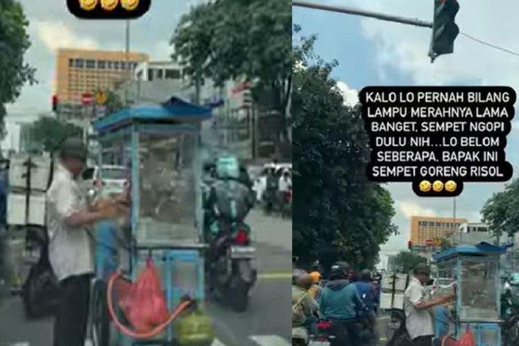 Sempat-sempatnya, sambil nunggu lampu merah pedagang risol ini goreng dagangannya dengan santai. Begini gayanya