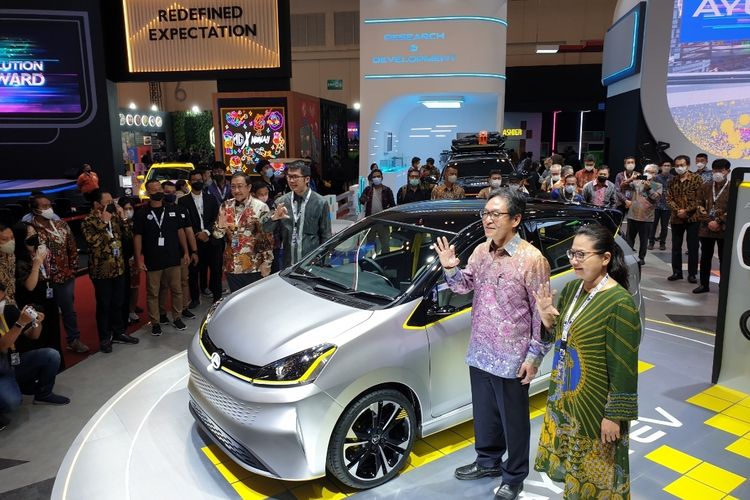 Di hari pertama penyelenggaraan GIIAS, Kamis (11/8/2022), PT Astra Daihatsu Motor menghadirkan Daihatsu Ayla listrik dan Rocky Hybrid