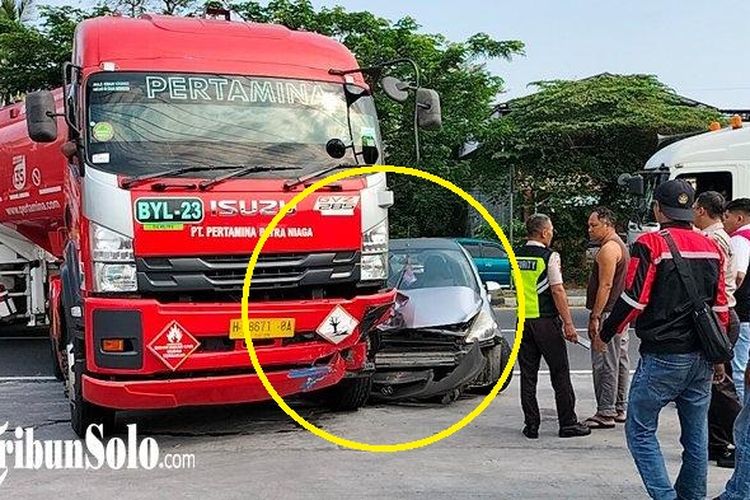 Honda Jazz kena sambut truk tangki yang mental karena bagian buntut disodok truk boks di Teras, Boyolali, Jawa Tengah