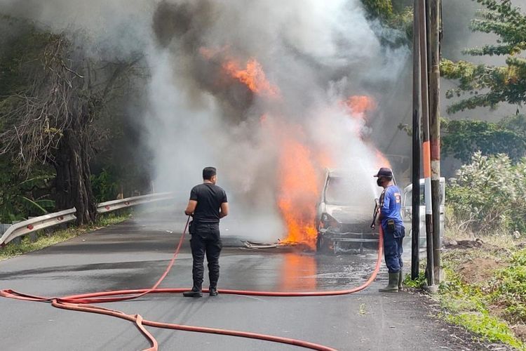 Nissan Serena ludes diamuk si jago merah berawal ada korsleting di bagian depan mobil. Begini kronologinya