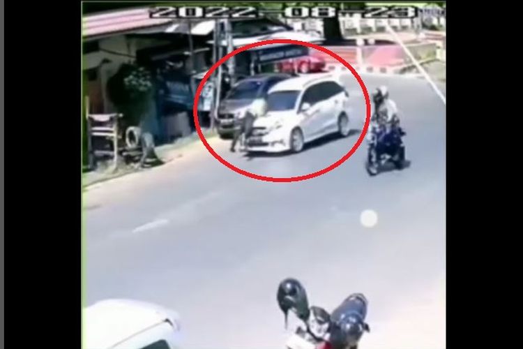 Seorang anggota polisi bergelantungan di kap Mobilio yang nekat kabur saat ada razia kelengkapan surat kendaraan