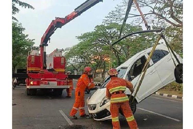 Honda Brio jumpalitan setelah tabrak trotoar dan batu, roda terpaksa diikat tali truk crane di Mulyorejo, Surabaya, Jawa Timur
