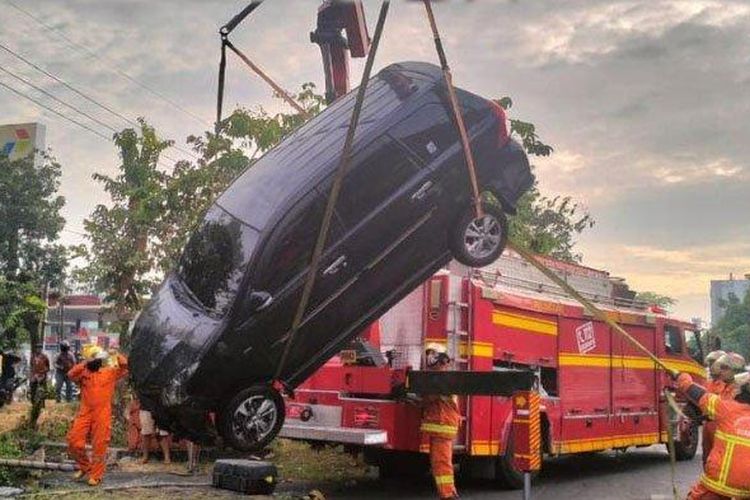 Toyota Avanza terjungkal ke parit di jalan raya Jemursari, Wonocolo, Surabaya akibat sopir merek melek, moncong belepotan comberan