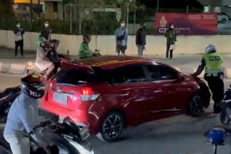 Toyota Yaris merah pelat F ini sedang diburu polisi usai nekat langgar ganjil genap dan tabrak polisi yang bertugas
