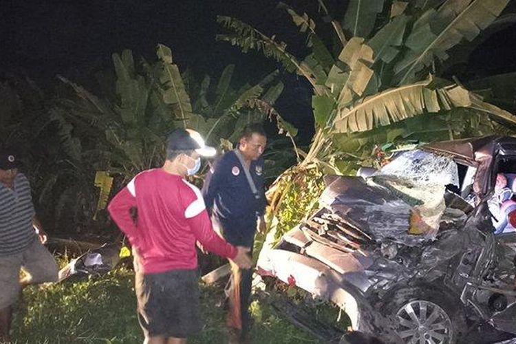 Suzuki APV ringsek wajah sampai ke kabin usai terperosok ke parit. Satu penumpang duduk di samping sopir meninggal dunia
