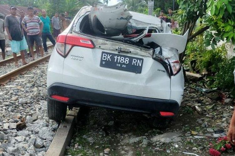 Honda HR-V dibawa anggota TNI dan calon istri koprol sejauh delapan meter, ditebas KA U85B Sri Relawangsa di Deli Serdang