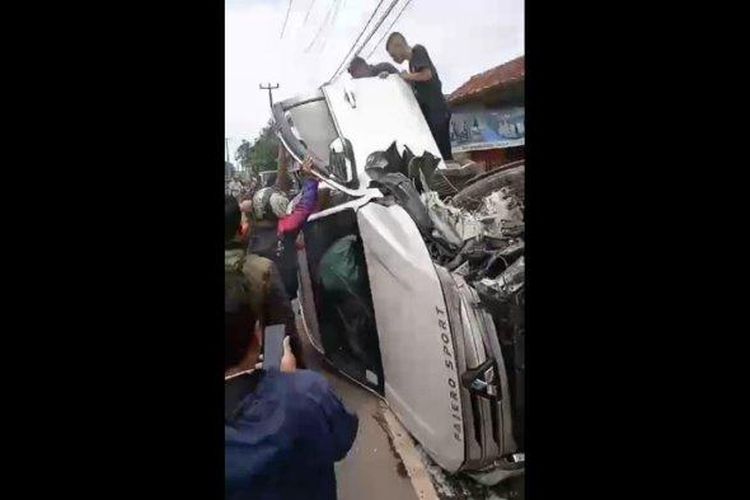 Mitsubishi Pajero Sport bikin gaduh jalan raya Cisolok, kampung Marinjung Tengah, Karangpapak, Sukabumi, bodi sobek sabet warung, berakhir gelimpang