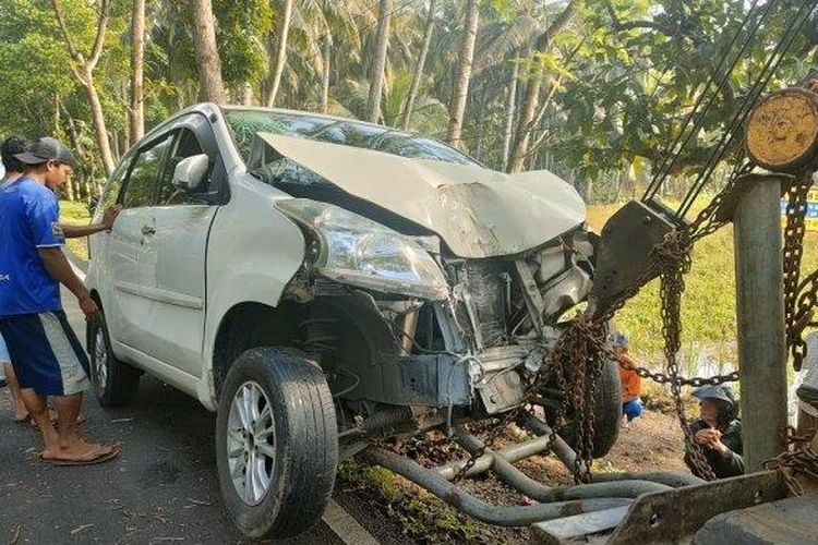 Gara-gara salip dan digunting bus, Toyota Avanza isi 8 orang babak belur bodi depannya lawan pohon mahoni.