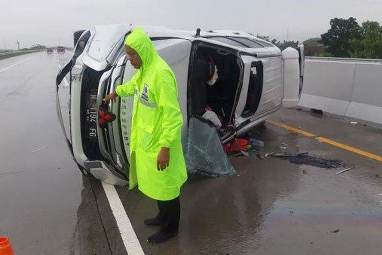 Kronologi Mitsubishi Pajero Sport berisi satu keluarga terguling di ruas tol Ngawi-Madiun, melintir saat jalan basah