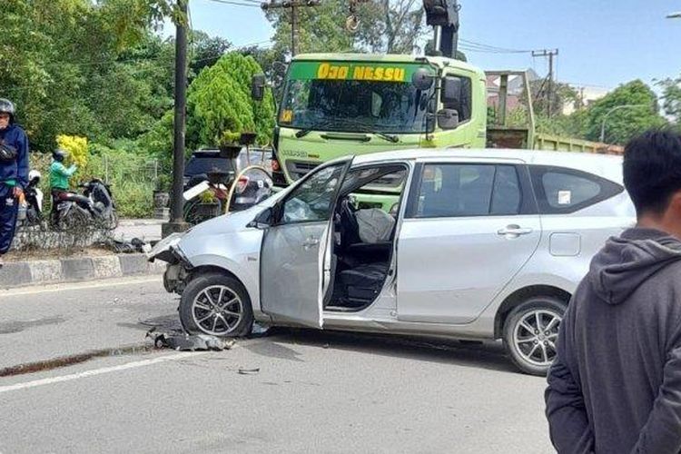 Toyota Calya terkulai di tengah jalan, bodi depan rontok dan airbag meledak menghantam pembatas jalan di Gunung Elai, Bontang Utara, Kalimantan Timur
