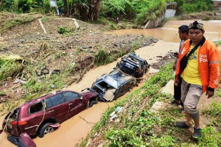 Enam mobil jadi bangkai usai kesapu banjir bandang hingga terseret sampai 2 kilometer. Kabin isinya batu