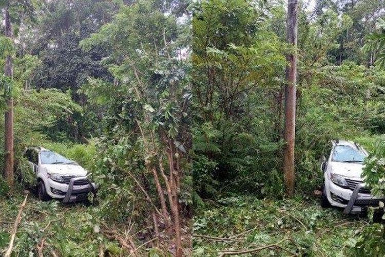 Toyota Fortuner terpelanting hebat usai salip kendaraan lain, babat habis semak belukar dan tiang hingga atap gepeng samping