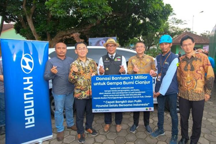 Hyundai serahkan donasi Rp 2 Milyar kepada Gubernur Jawa Barat, Ridwan Kamil, untuk bantu korban gempa di Cinajur, Jawa Barat