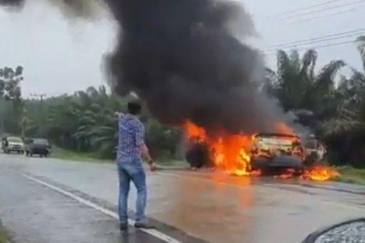 Daihatsu Terios dan Toyota Vios gosong jadi bangkai setelah terlibat adu banteng. Api berawal dari korsleting listrik usai bertabrakan
