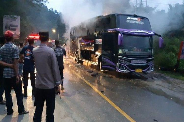 Bus Dzakky Buana Tour berisi rombongan istri anggota DPRD Kuantan Singingi jadi bangkai, terbakar di Muaro Kalaban, Silungkang, Sawahlunto