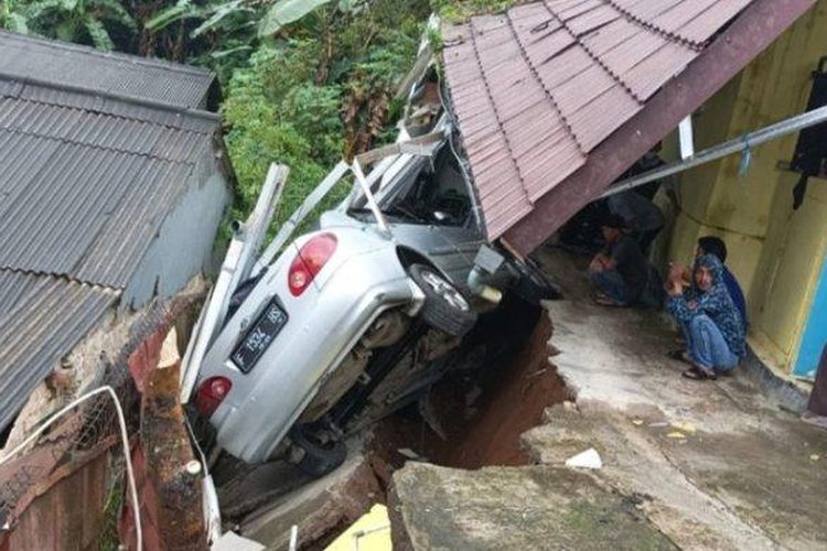 Tanah longsor landa desa Kopo dan Citeko, Cisarua, Bogor, Jawa Barat, Toyota Corolla Altis terjungkal hebat akibat pondasi garasi ambrol