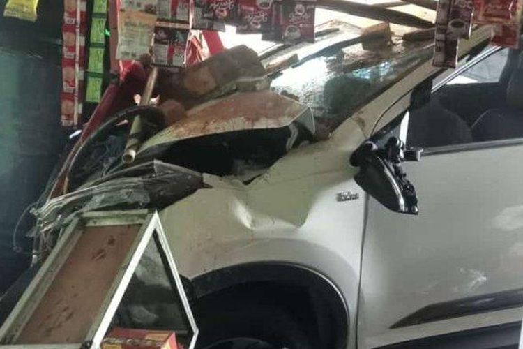 Toyota Rush tabrak warung kelontong hingga porak-poranda di jalan raya Ciparay, Jampangkulon, Sukabumi akibat tubuh pengemudi mendadak kaku