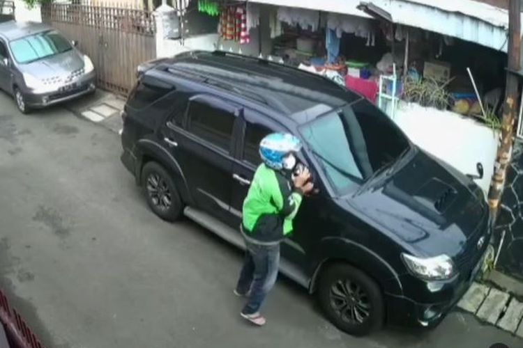 Rekaman CCTV maling spion Toyota Fortuner di Kebon Jeruk, Jakarta Barat mengenakan jaket ojek online