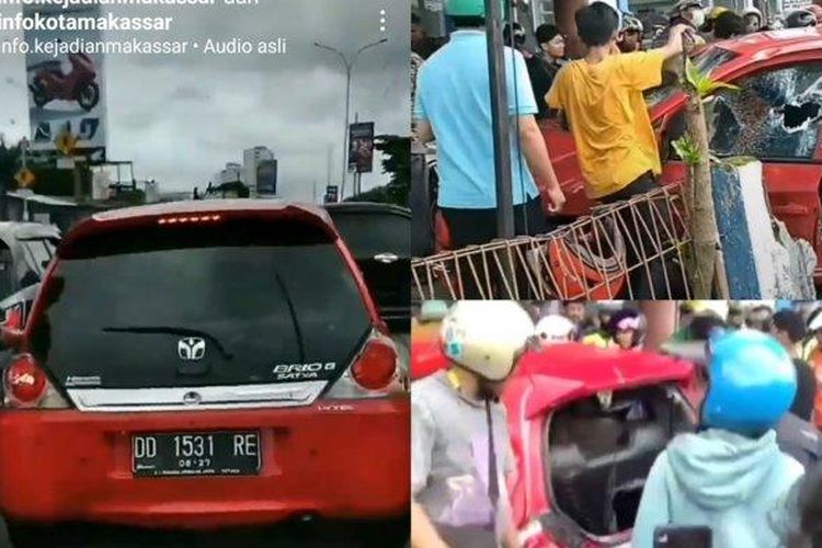 Honda Brio merah dikejar massa dan berakhir dibikin babak belur. Berawal pengemudi kabur habis isi BBM di SPBU
