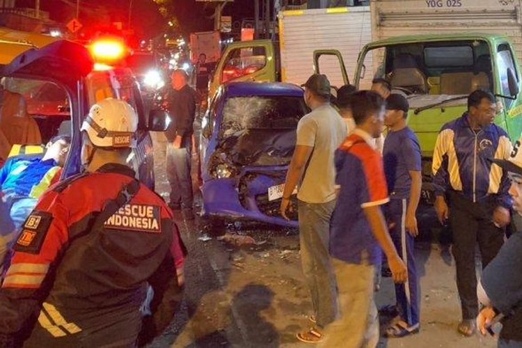Honda Jazz GD3 bikin runyam, tusuk belakang Toyota Avanza kecepatan tinggi, mental hantam truk boks di Godean, Yogyakarta