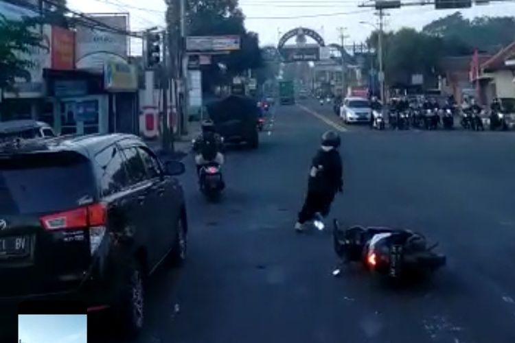 Seorang pengendara motor wanita panik dan tinggalkan motornya di tengah jalan karena dengar suara sirine mobil damkar yang mau lewar