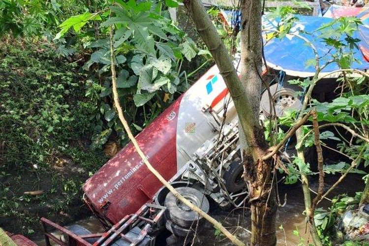 Truk tangki Pertamina tersungkur ke sungai manten di desa Krebet Senggrong, Bululawang, Malang, sopir tembus kaca terseret arus 200 meter
