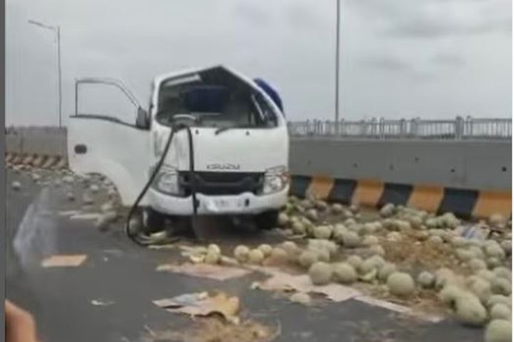 Isuzu Traga muatan buah melon terguling setelah menggayang beton pembatas jembatan Suramadu akibat pecah ban belakang kiri