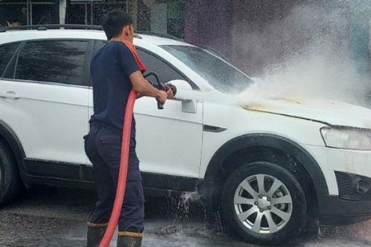 Chevrolet Captiva terbakar saat parkir, kap mesin menguning dadakan hingga terpaksa disemprot air pemadam kebakaran