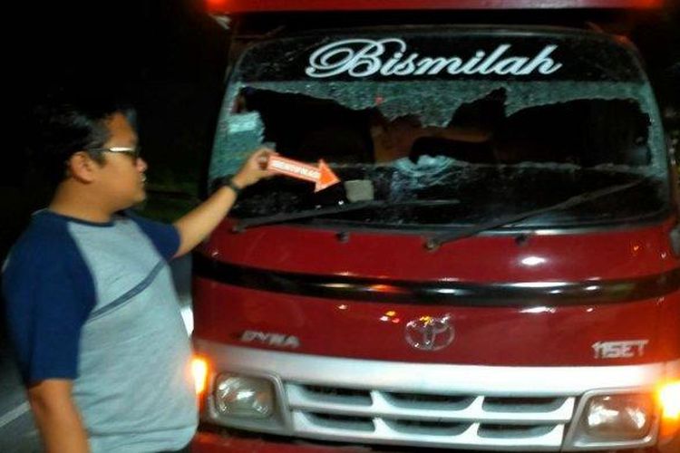 Dua truk pecah kaca depan usai jadi sasaran atlet lempar batu di Mojokerto. Pelaku sempat terlihat boncengan naik Honda BeAT