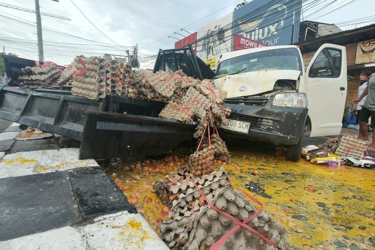 Tabrakan amis beruntun di Tapos, kota Depok, Honda Mobilio tabrak Suzuki Carry muatan telur, Daihatsu Gran Max, Honda Astrea, BeAT dan Scoopy terlibat