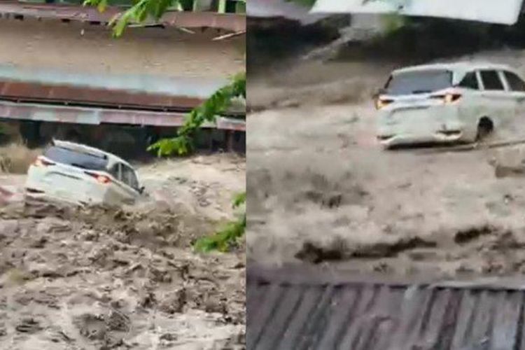 Toyota Avanza putih terseret arus banjir bandang sejauh 1 kilometer. Saat ditemukan, kondisi bodi sudah tak berbentuk