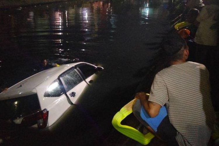 Toyota Calya kecemplung kanal pasar Cidu, Makassar karena sopir inisiatif mundur saat panik papasan dengan mobil lain