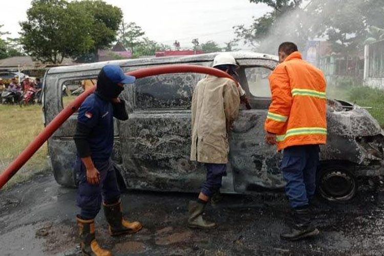 Daihatsu Gran Max terbakar hebat disertai dua kali ledakan di lapangan desa Curahpetung, Kedungjajang, Lumajang, berawal mesin overhat