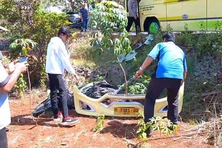 Kecelakaan Yamaha Vega ZR disenggol dan ditabrak dua bus pariwisata di Glagah, Kemiri, Tanjungsari, Gunungkidul
