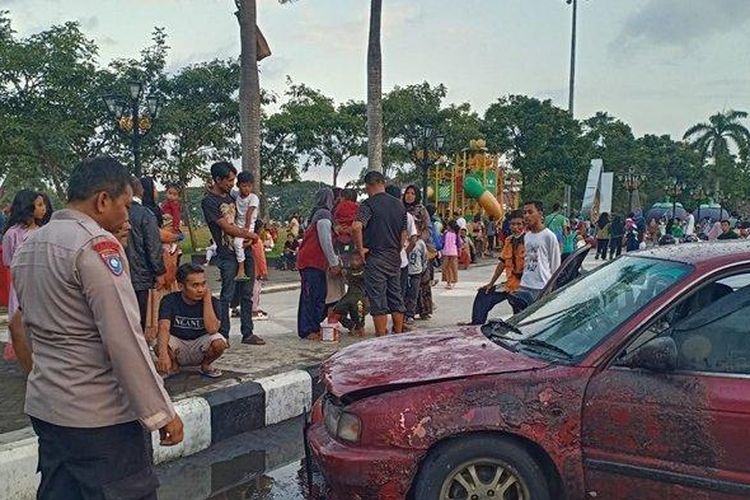 Suzuki Baleno warga Jakarta Barat melepuh parah di alun-alun Purworejo, Jawa Tengah, terbakar akibat mesin meledak beberapa detik lepas distarter