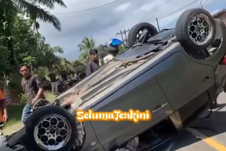 Pecah ban depan kiri, Honda Brio terpelanting hantam marka jalan, batang pohon kelapa dan belimbing lalu koprol tatap langit di Seluma Barat