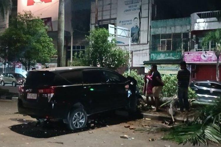 Kijang Innova hitam terjang pembatas jalan dan bikin pohon ambruk saat kebut-kebutan dengan mobil lain. Sopir diduga terpengaruh minuman memabukkan