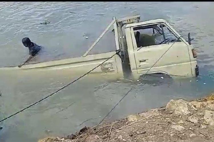 Truk engkel terecebur ke sungai Citanduy bersama 100 sak semen dan perahu akibat sistem pengereman gak mumpuni