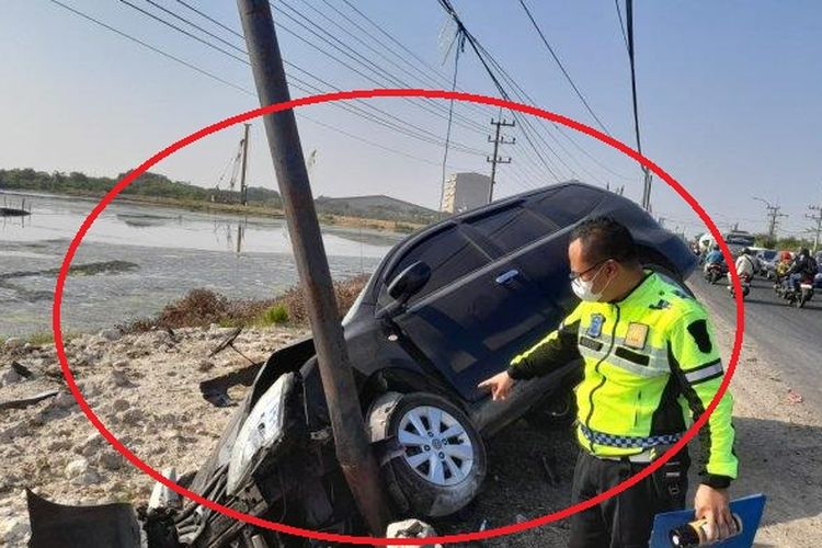 Nissan Grand Livina terjang 3 pemotor dari arah sebaliknya lalu terjungkal tabrak tiang di tepi tambak Manyar, Gresik