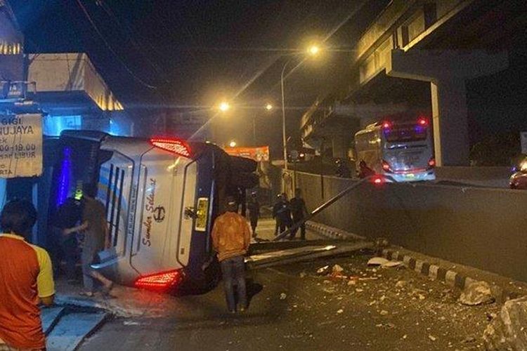 Bus Sumber Selamat rebahan di jalan dan bikin beton pembatas kocar-kacir karena oleng. Rugi lumayan, tembus Rp 50 juta