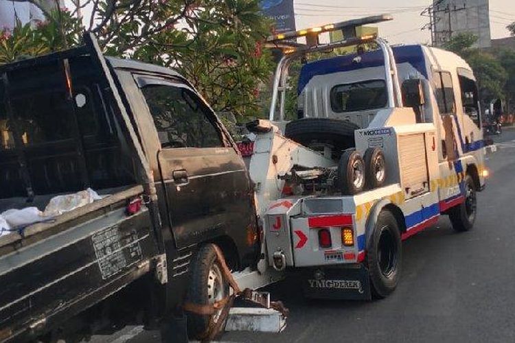 Roda Depan Suzuki Carry Pikap Pagi-pagi Diikat Derek, Bapak dan Anak Kesakitan
