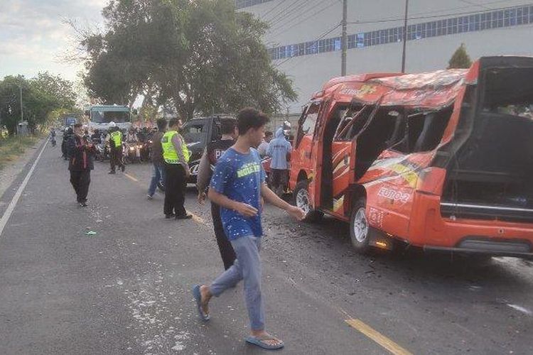 Isuzu Elf babak belur saat dibawa ngebut namun ban belkang pecah hingga akhirnya oleng dan terbalik.